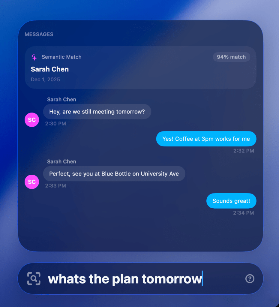 Semantic search for Messages and Files uses an on device model optimized for Apple Silicon, utilizing the Neural Engine – and it actually works. Unlike Messages search which is often unreliable, Vector will show you what you’re looking for. You can search for keywords, or you can enter a general phrase or question and it’ll find you the relevant texts. Same goes for files.