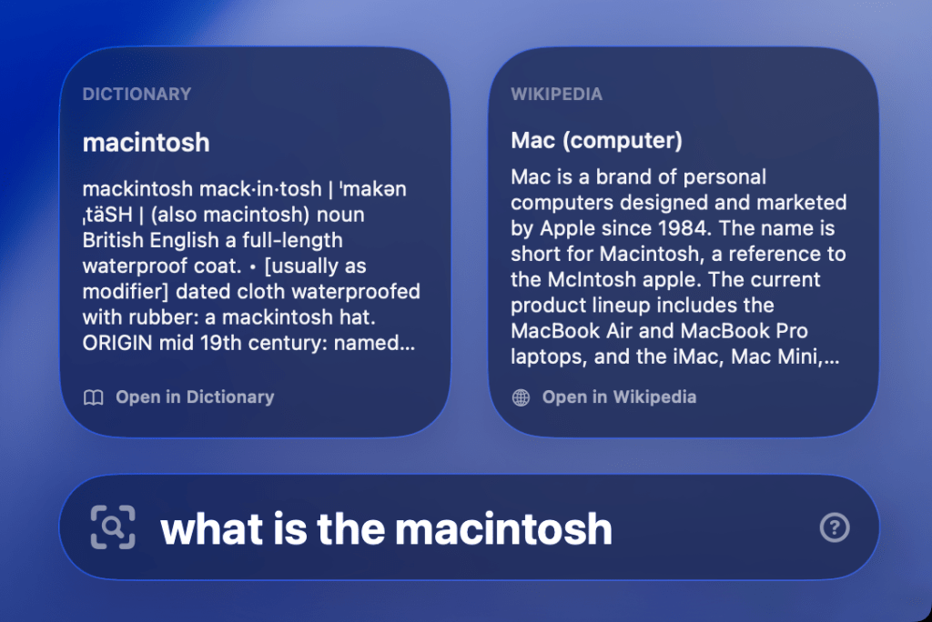 It also offers calculator and currency conversion features – all in a nice little search bar at the bottom right corner of your Mac (though you do have the option to move it if you’d like to.)