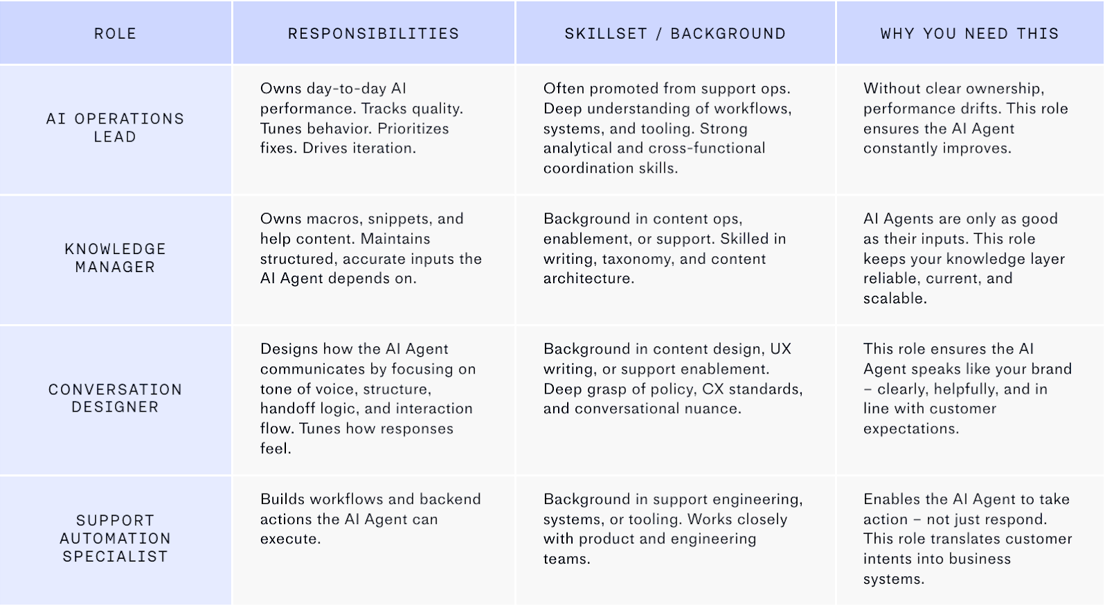 This is why new roles are important. It’s not because they’re trendy, but because the performance of your support organization now depends on the performance of AI, and no AI Agent succeeds without clear ownership of content, behavior, workflows, and improvement cycles.