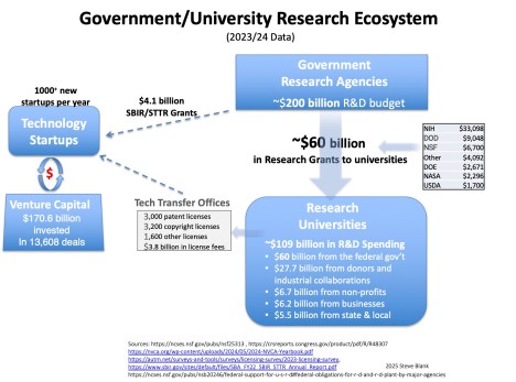 From the outside (or if you’re an undergraduate) universities look like a place where students take classes and get a degree. However, in a research university there is something equally important going on. Science faculty in these schools not only teach, but they are expected to produce new knowledge—through experiments, publications, patents, or creative work. Professors get grants and contracts from federal agencies (e.g., NSF, NIH, DoD), foundations, and industry. And the university builds Labs, centers, libraries, and advanced computing facilities that support these activities.