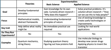 - Two types of experimentalists; Basic science (learn new things) or applied science (practical applications of the science)