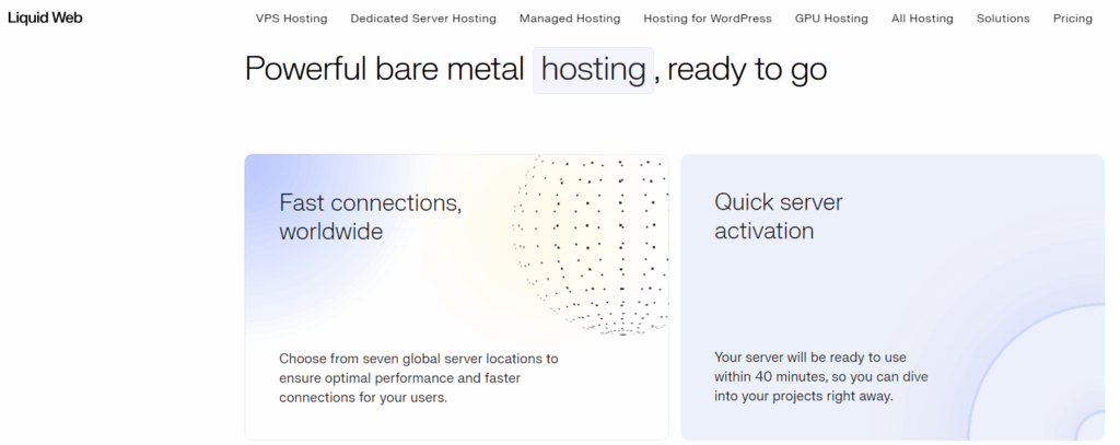 Liquid Web’s bare metal servers are designed for customers who want dedicated hardware plus serious managed support. Plans run on high-end hardware (NVMe SSDs, modern Xeon Gold processors, high-bandwidth connections) and are spread across multiple data center locations, giving you good geographic redundancy.