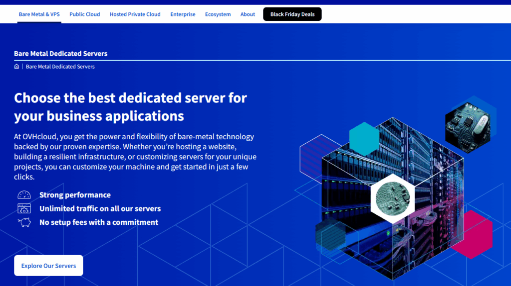 OVHcloud is one of the most popular bare metal providers globally, especially for cost-conscious deployments. Their dedicated/bare metal servers come with: