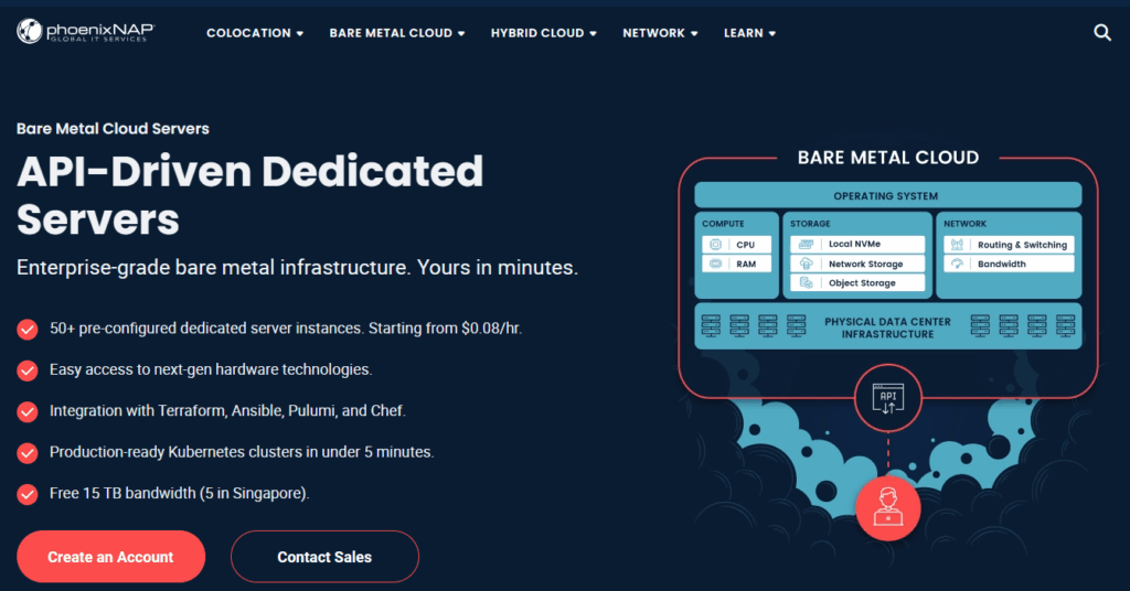 phoenixNAP offers a Bare Metal Cloud platform that sits somewhere between traditional dedicated hosting and public cloud: you get true bare metal servers, but with API, CLI, and web UI–driven provisioning, global locations, and flexible hourly or monthly billing.